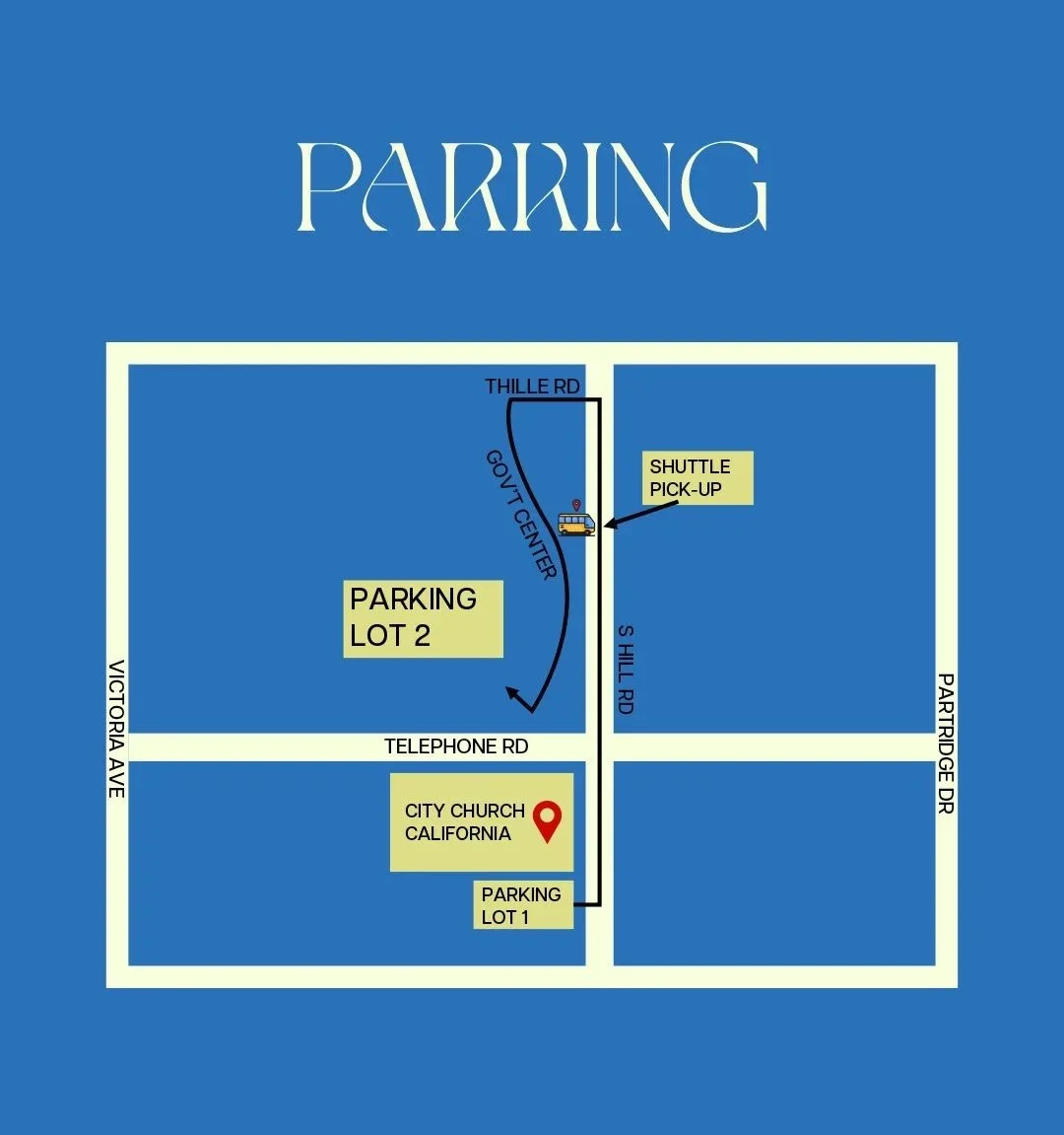 Parking will be available in our main church lot, with overflow parking at the Government Center. Shuttle service will be running during the 8:30AM, 10:00AM, and 11:30AM services to help bring people to and from overflow parking.